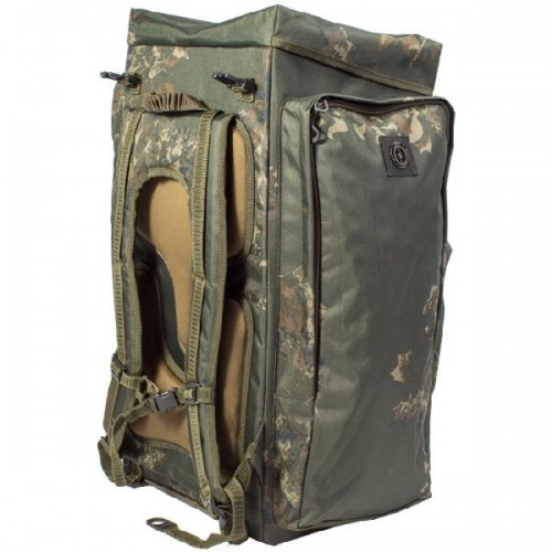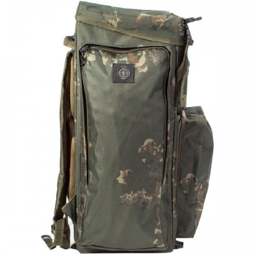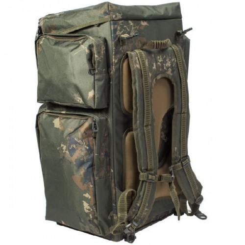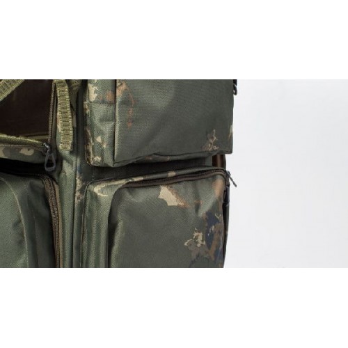 Рюкзак имеет внутреннюю жесткую камеру и разделен на две секции. Крышка верхнего отделения открывается с помощью застежки-молнии и откидывается на матерчатых лямках, превращаясь в удобный лоток или подставку. Большой тыльный карман из ЭВА вмещает большую коробку для снастей, а три внешних кармана на полную длину рюкзака — род-поды и буз-бары.