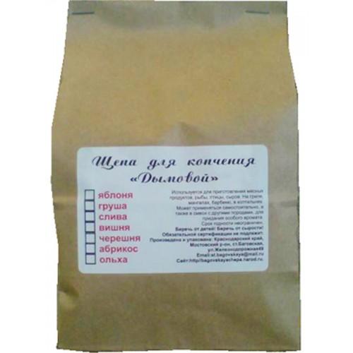Фруктовая щепа для копчения - это смесь щепы абрикоса, черешни и яблони. Дым от фруктовой щепы придаёт продукту приятный аромат и цвет. Фруктовая щепа применяется при копчении мяса, сала, рыбы. Щепа расфасована в пакеты. В пакете 1,7 кубических дециметра щепы. Этого достаточно для 10 - 12 копчений.