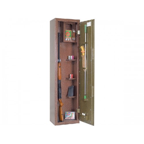 Прочный стальной корпус. Толщина боковых стенок и лицевой дверной панели — 2 мм. Дверь на внутренних петлях, имеет коробчатую конструкцию и усилена фальшпанелью. Запирается двумя сертифицированными ключевыми замками — II класс, сделаны в России. Внутреннее пространство оборудовано тремя съемными полками с отбортовкой, запираемым патронным отделением и роликовыми ложементами на два ствола. Внизу — ковролиновый коврик. Дверь с внутренней стороны имеет функциональные навески — карманы под масленки, рамку под ножи, гребенку под ключи и шомпола. Поверхность корпуса имеет износостойкое покрытие порошкового типа. Цветовое исполнение: медно-бронзовый антик. Предусмотрена возможность анкерного крепления к стене.