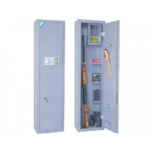 Кодовый замок работает с комбинациями из 3-8 цифр, оборудован защитой от подбора кода и функцией аварийного открывания с помощью мастер-ключа. Питание осуществляется от "пальчиковых" батареек — 1,5В класса АА. В зависимости от интенсивности эксплуатации заряда хватает на год-полтора. Индикация своевременно сигнализирует о необходимости замены батареек. Внутреннее пространство оборудовано тремя съемными полками с отбортовкой, запираемым патронным отделением и роликовыми ложементами на два ствола. Внизу — ковролиновый коврик. Дверь с внутренней стороны имеет функциональные навески — карманы под масленки,рамку под ножи, гребенку под ключи и шомпола. Поверхность корпуса имеет износостойкое покрытие порошкового типа. Цветовое исполнение: серый с эффектом молотковой эмали. Предусмотрена возможность анкерного крепления к стене.