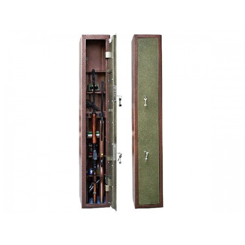 Прочный стальной корпус. Толщина боковых стенок и лицевой дверной панели — 2 мм. Дверь на внутренних петлях, имеет коробчатую конструкцию и усилена фальшпанелью. Запирается двумя сертифицированными ключевыми замками — II класс, сделаны в России. Внутри — запираемое на ключ патронное отделение, четыре съемные полки и роликовые ложементы на три ствола. Ружья ставятся перед полками, аккуратно и прочно фиксируются ложементами зажимного типа (произв. Германия). Дверь с внутренней стороны имеет функциональные навески — карманы под масленки, рамку под ножи, гребенку под ключи и шомпола. Внизу — ковролиновый коврик. Поверхность корпуса имеет износостойкое покрытие порошкового типа. Цветовое исполнение: медно-бронзовый антик. Предусмотрена возможность анкерного крепления к стене.