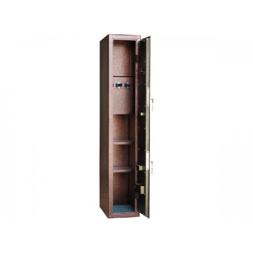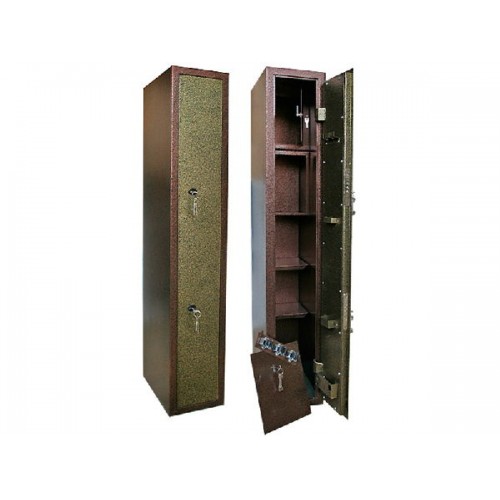 Прочный стальной корпус. Толщина боковых стенок и лицевой дверной панели — 2 мм. Дверь на внутренних петлях, имеет коробчатую конструкцию и усилена фальшпанелью. Запирается двумя сертифицированными ключевыми замками — II класс, сделаны в России. Внутри — запираемое патронное отделение, две съемные полки и удобные роликовые ложементы на три ствола. За ложементами имеется потайное отделение, запираемое высокосекретным ключевым замком. Дверь с внутренней стороны имеет функциональные навески — карманы под масленки, рамку под ножи, гребенку под ключи и шомпола. Внизу — ковролиновый коврик. Поверхность имеет износостойкое покрытие порошкового типа. Цветовое исполнение: медно-бронзовый антик. Предусмотрена возможность анкерного крепления к стене.