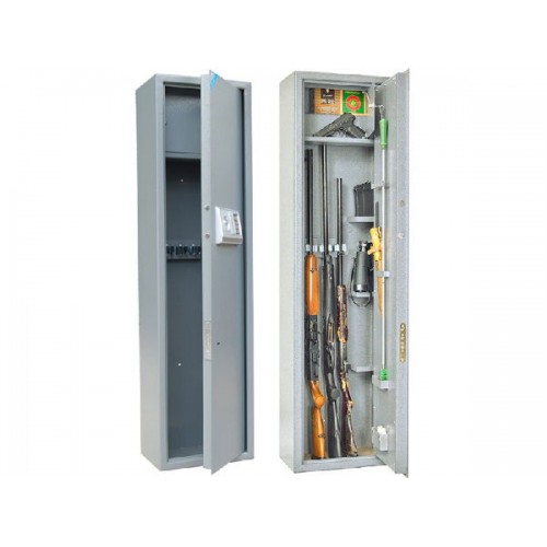 ОШ-4Э — оружейный шкаф на четыре ружья высотой до 1350 мм и боеприпасы к ним. Удовлетворяет всем требованиям МВД к хранению оружия физическими лицами. Взломостойкие качества подтверждены сертификатом соответствия ГОСТ Р 50862-2005. Прочный стальной корпус. Толщина боковых стенок и лицевой дверной панели — 2 мм. Дверь на внутренних петлях, имеет коробчатую конструкцию и усилена фальшпанелью. Запирается двумя замками: кодовым электронным и ключевым II класса. Кодовый замок работает с комбинациями из 3-8 цифр, оборудован защитой от подбора кода и функцией аварийного открывания с помощью мастер-ключа. Питание осуществляется от "пальчиковых" батареек — 1,5В класса АА. В зависимости от интенсивности эксплуатации заряда хватает на год-полтора. Индикация своевременно сигнализирует о необходимости замены батареек. Внутреннее пространство оборудовано тремя съемными полками с отбортовкой, запираемым патронным отделением и роликовыми ложементами на четыре ствола. Внизу — ковролиновый коврик. На внутренней стороне двери — карманы, рамка под ножи и гребенка под шомпола. Поверхность корпуса имеет износостойкое покрытие порошкового типа. Цветовое исполнение: серый с эффектом молотковой эмали. Предусмотрена возможность анкерного крепления к стене.