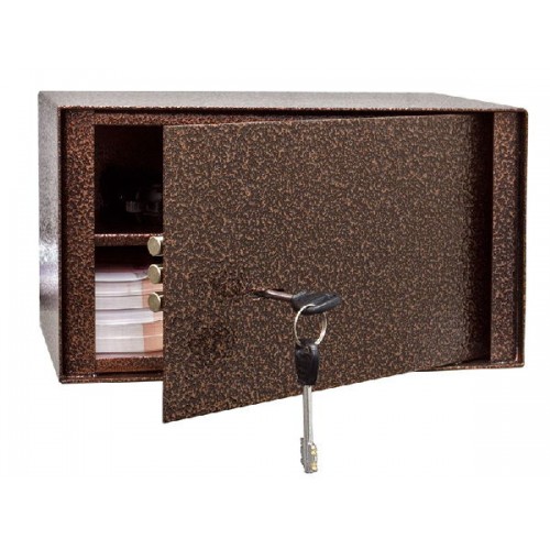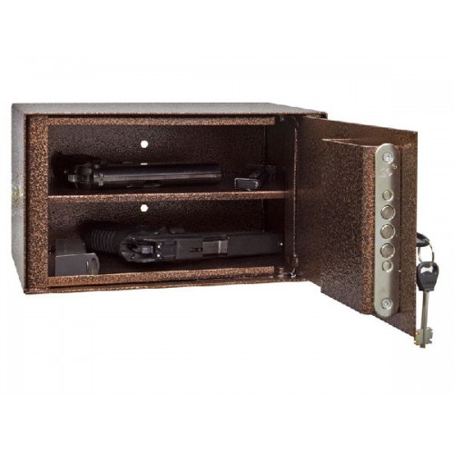 Шкаф для пистолетов с полкой. Сталь 2 мм. Шкаф оборудован ключевым замком высокой секретности. На задней стенке сейфа есть два отверстия для крепления к стене. Шкаф окрашен порошковой краской сочетающей прекрасный внешний вид и устойчивость к царапинам и потертостям. Цвет: Медь. Шкаф удовлетворяет всем требованиям МВД к хранению боевого, гражданского и служебного оружия.