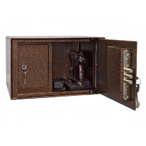 ШП-3 — сейф на 2 пистолета. Соответствует всем требованиям МВД для надлежащего хранения боевого, служебного и гражданского оружия. Корпус изготовлен из листовой стали толщиной 3 мм. Запирается трехригельным ключевым замком (Про-Сам, Рязань) сувальдного типа. Замок сертифицирован — II класс взломостойкости. Внутри — запираемое на ключ патронное отделение. Поверхность имеет антикоррозийное покрытие порошкового типа. Цветовое исполнение: медный антик.