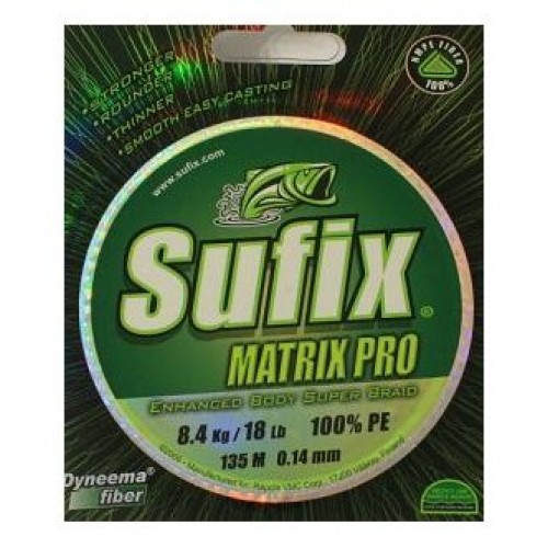 Sufix Matrix Pro - уникальная высококачественная плетеная леска, отвечающая всем требованиям современного рыболова: прочная, удобная в использовании, почти не растягивающаяся. Уникальная технология плетения Matrix позволяет изготовить круглую в сечении леску, работающую гораздо лучше, чем обычные плоские. Круглая плетенка лучше ведет себя при забросе, поэтому вы сможете бросать точнее и дальше. Благодаря материалу - чистому высокомолекулярному полиэтилену (100% PE!), леска обладает высочайшей прочностью и, в то же время, обеспечивает высокую чувствительность и быструю подсечку. Кроме того, Matrix Pro отличается невероятной износостойкостью.