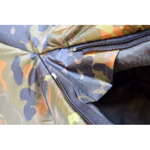 Супертеплый зимний спальник-кокон камуфляжной расцветки для людей небольшого роста. Рассчитан на экстремальную температуру до -27°С. Благодаря давно и хорошо зарекомендовавшему себя немецкому камуфляжу Flecktarn спальный мешок останется незамеченным в любом лесу. Предназначен прежде всего для охотников и рыболовов, а также для любителей стиля "милитари".