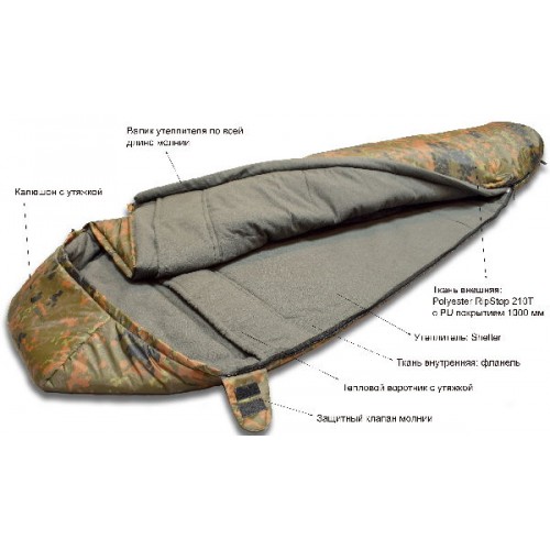 Супертеплый зимний спальник-кокон камуфляжной расцветки для людей небольшого роста. Рассчитан на экстремальную температуру до -27°С. Благодаря давно и хорошо зарекомендовавшему себя немецкому камуфляжу Flecktarn спальный мешок останется незамеченным в любом лесу. Предназначен прежде всего для охотников и рыболовов, а также для любителей стиля "милитари".