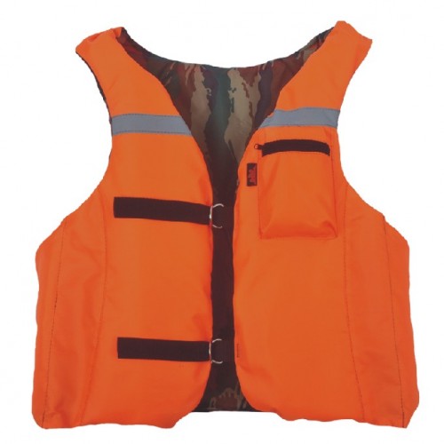 Жилет Таежник Рыбак двухсторонний (оранжевый / камуфляж) имеет центральную застежку на полукольцах и карман на молнии.