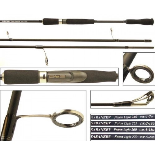 Спиннинг SABANEEV FOTON Light 240 имеющий тест 1-7 гр., является начальной и самой легкой моделью в серии. Он относится к весьма распространенному классу - ультралайт (UL). Однако для того, чтобы считаться классическим он имеет слишком большую длину - 2,4 м. Это очень удобно, если в процессе рыбалки, вы двигаетесь не по берегу, что чаще всего неудобно, а прямо по реке, как это делают нахлыстовики.