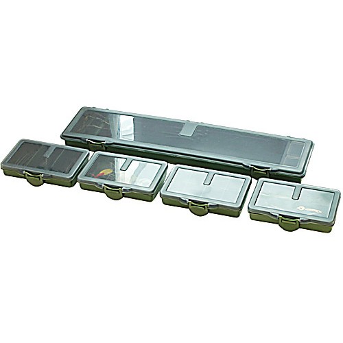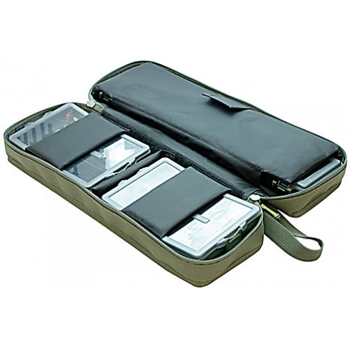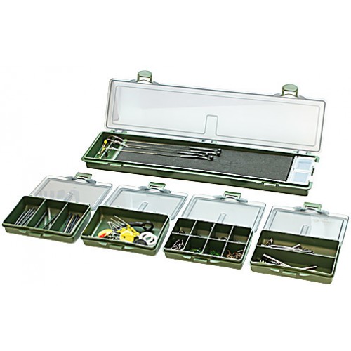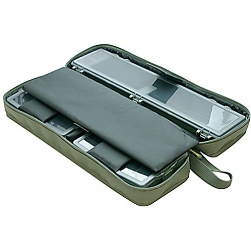 Сумка укомплектована рыболовной коробкой для готовых поводков длиной 34,5 см и четырьмя маленькими коробками для мелких аксесуаров: крючков, грузов и т.д.