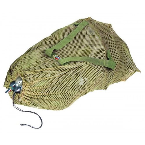 Эластичная сетка-рюкзак оливкового цвета предназначена для переноски подсадных уток и гусей различной комплектации. Она изготовлена из прочной полиэфирной сетки, благодаря которой вода беспрепятственно стекает с чучалок. Сетка оснащена двумя плечевыми лямками и может использоваться в качестве рюкзака. Горловина мешка утягивается шнурком. Сетка может вмещать до 36 стандартных чучал.