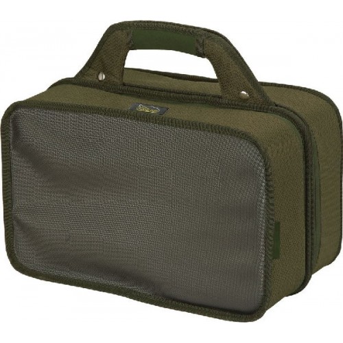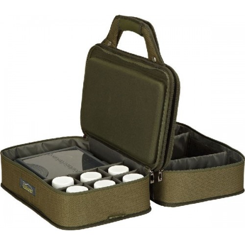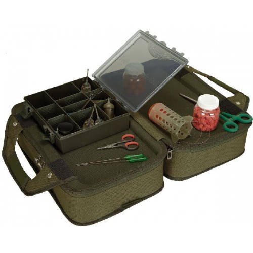 Особенностью сумки является то , что она открывается книжкой. Внутри два больших отсека. В первом есть коробка для мелких оснасток и 6 баночек для бойлов защищенных перегородками. Во втором отделении есть большой отсек со съемными перегородками. Также внутри есть крышки которые превращают сумку в столик.