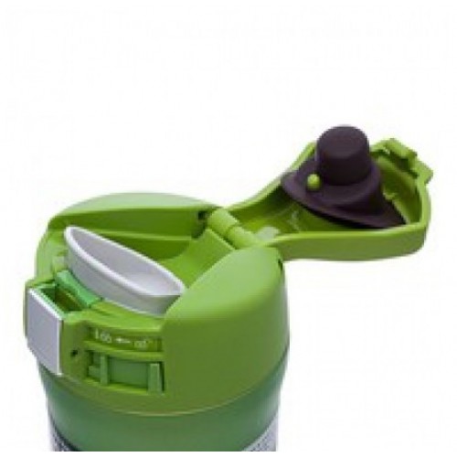 Термос Zojirushi SM-YAF оборудован съемной разборной крышкой, которая надежно фиксируется на широкой горловине резьбовым креплением. Ее открытие выполняется нажатием кнопки, после чего крышка свободно откидывается и фиксируется в удобном для питья положении. Закрывается легким движением руки. Защищена от самопроизвольного раскрытия передвижным предохранителем, который размещен рядом с кнопкой. Перед открытием сдвигается влево в сторону кнопки, при перемещении в обратном направлении блокирует крышку в закрытом положении.