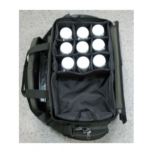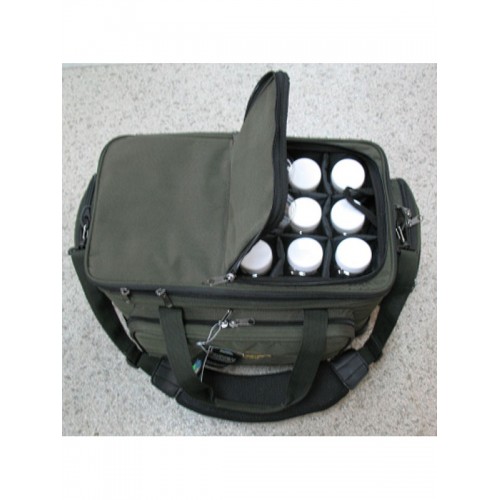 Термосумка для профессиональных рыболовов оборудована двумя объемными отделениями, специальными ячейками для банок с насадками и отдельным отделением для хранения до 10 кг. бойлов. Широкая удобная ручка облегчает транспортировку сумки.