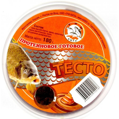 Тесто Три Кита протеиновое – уже готовая насадка, в состав которой входят следующие ингредиенты: мука, манка, различные красители, растительное масло, натуральные ароматизаторы и сироп. Тесто может быть использовано в виде насадки на крючок или для прикормки рыбы в месте непосредственной ловли.