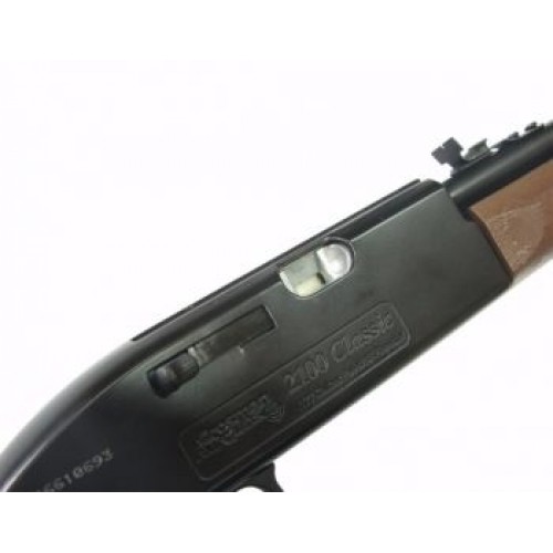 Crosman 2100 В — многофункциональная пневматическая винтовка. Она подойдет и для охоты, и для развлекательной стрельбы по мишеням. Давление воздуха, необходимое для стрельбы, обеспечивается предварительной накачкой посредством специального рычага. В качестве боеприпасов используются стальные шарики и свинцовые пульки. Ствол — стальной, ложа — прочный пластик. Рукоять пистолетного типа используется в качестве бункера для металлических шариков. Свинцовые пули заряжаются сбоку.