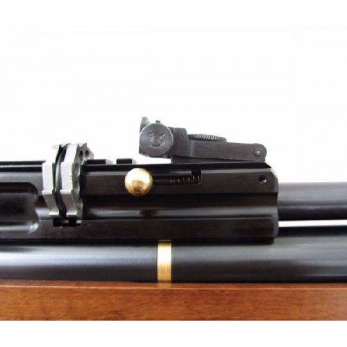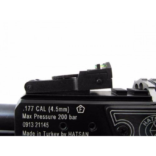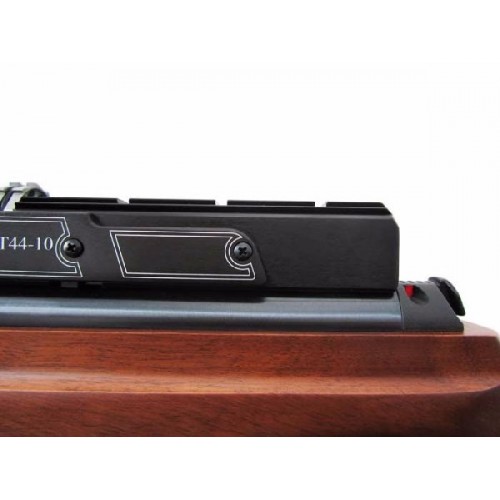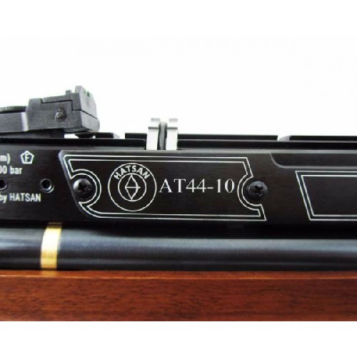 Первая РСР-винтовка турецкого производителя Hatsan. Отличается эргономичной тактической ложей, сделанной из дерева. Пистолетная рукоять обеспечивает удобное удержание винтовки. Новая ложа снабжена тремя планками для крепления сошек, а также других аксессуаров. Стальной нарезной ствол с чоком, съемный десятизарядный барабанный магазин, съемный воздушный резервуар емкостью 230 см3, встроенный в воздушный резервуар манометр, ручной и автоматический предохранители, регулируемые мушка и прицельная планка с фибероптическими нитями, металлический крючок золотого цвета, регулируемый спуск. На пистолетную рукоятку и щеки цевья установлены специальные противоскользящие накладки. На ложе имеются гнезда для запасных магазинов. Съемный выдвижной приклад дает возможность подстроить винтовку под конкретного стрелка, а также облегчает транспортировку. В комплекте с винтовкой Hatsan AT44-10 Tact идут 3 магазина на 10 пуль, а также сошки и ремень. Начальная скорость пули - 325 м/с. Вес винтовки - 3,9 кг, длина - 99 см.
