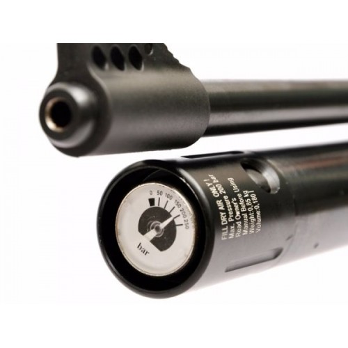 Резервуар винтовки изготовлен из алюминия. Его объем - 255 см3 (до 300 бар), что обеспечивает до 70 выстрелов на полной мощности. Резервуар можно снять/установить без потери воздуха, что позволяет использовать запасные резервуары. Встроенный манометр позволяет в любой момент проверить уровень давления. На винтовке установлена планка для крепления оптического прицела.