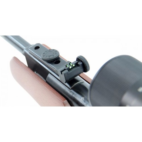 На конце ствола - надульник, защищающий переднюю фаску и облегчающий перезаряжание. Открытые прицельные приспособления снабжены цветными вставками — красным в мушке и зелеными в целике. Мушка закрыта намушником, предохраняющим от случайных ударов. Диаметр мушки и ширина прорези грамотно подобраны, прицеливание очень удобное и комфортное. На компрессоре отфрезерованы пазы «ласточкин хвост» для крепления оптики, так же высверлен упор для стопора крепления колец или моноблока. Скорость пули - 305 м/с. Система взведения/перезарядки - переламыванием ствола. Предохранитель - автоматический, рычажный.