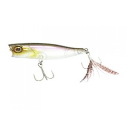 На хвостовом тройнике есть маленькая пёстрая опушка из шейного петушиного пера, дополнительно привлекающая рыбу и стабилизирующая поппер при проводке. Созданный для ловли форели в Японии, у нас замечательно ловит голавля, язя, жереха, окуня и щуку.