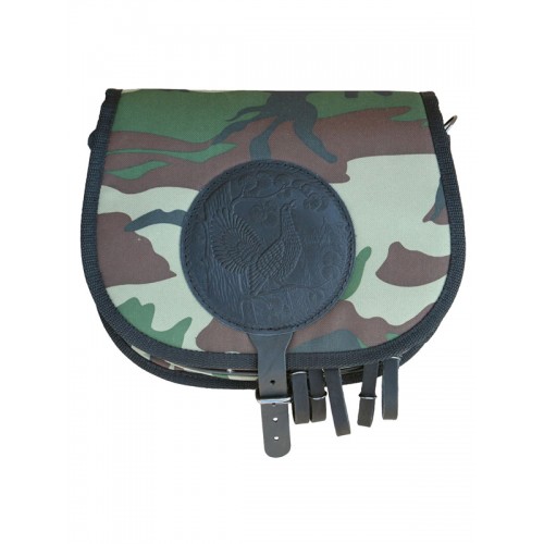 Ягдташ изготовлен в традиционной форме из специальной ткани. Имеет два отделения для снаряжения. Оснащен подвеской «Утятница» и сетчатым мешком для дичи. Для дополнительного крепления на поясной ремень ягдташи комплектуются двумя быстросъемными шлевками. В производстве используется итальянская фурнитура, которая практически не звенит и не дает бликов. Раскрой производится на специальном оборудовании, что гарантирует высокое качество изделий. Изделие украшено миниатюрами охотничьей тематики, нанесенными методом горячего тиснения.