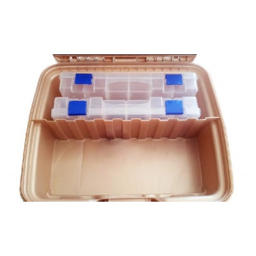 Вместительный рыболовный ящик для приманок, оснастки и аксессуаров. Под верхней крышкой - большое отделение, способное вместить достаточно крупное снаряжение типа фонарика, катушки и т.п. Ящик изготовлен из прочного качественного пластика.