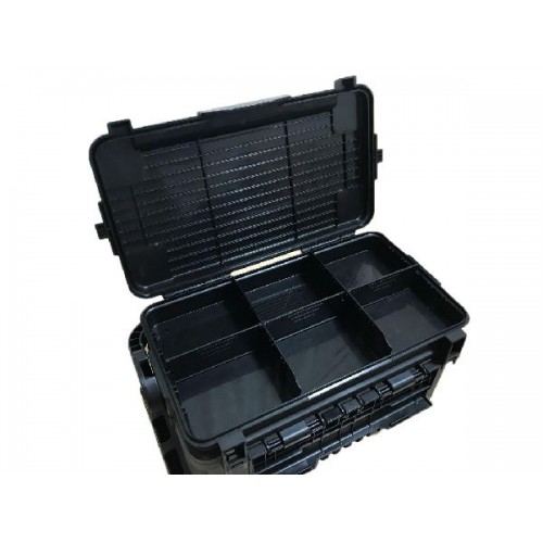 Место хранения, предусмотренное в крышке, разделено на три одинаковых отсека, каждый из которых можно разделить еще на две или три части с помощью шести съемных перегородок. Это дает возможность максимально комфортно организовать пространство для приманок и аксессуаров. Еще одна важная особенность данного ящика – это его многофункциональная ручка. Она невероятно удобна для переноски, а, кроме этого, она препятствует случайному открыванию ящика при движении. Также она служит опорой для верхнего отделения ящика, которое в открытом состоянии может использоваться в качестве столика.