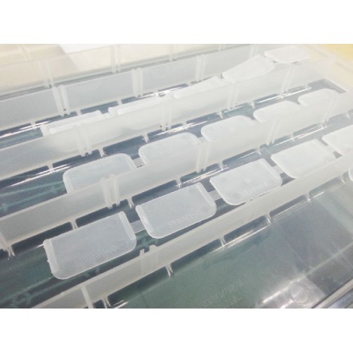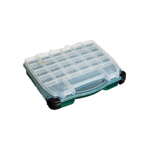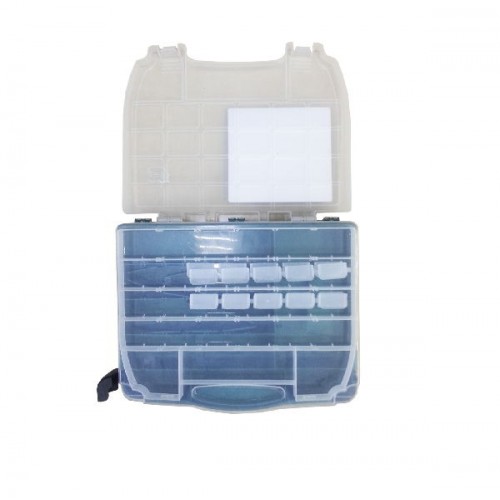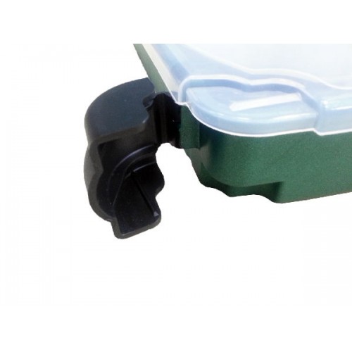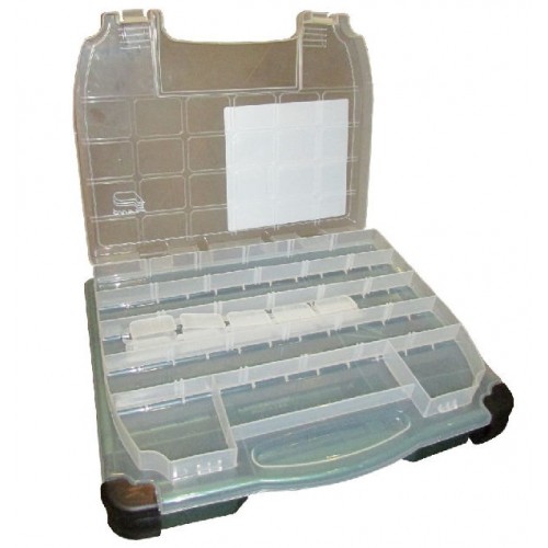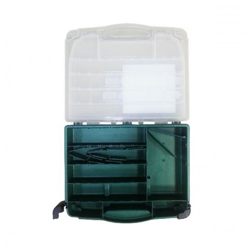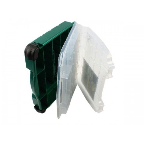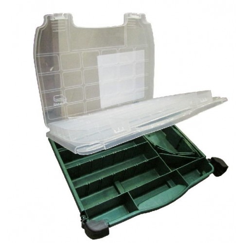 Верхнее отделение расположено в крышке прозрачного цвета. Нижнее разделено на отсеки для хранения наживки и других предметов. Количество отделений от 15 до 52, регулируются с помощью съемных перегородок.