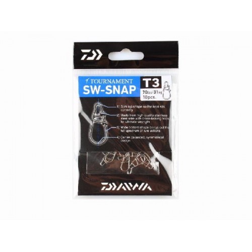 Японская технологичность, вековые традиции металлообработки, делают очевидными многие преимущества застежек Daiwa: Запорная скоба фиксируется изнутри, благодаря чему застежка Daiwa Tournament SW-Snap T-3 отлично соединяется с вертлюгом, не цепляется за препятствия, не накручивает леску; Симметричная форма и отличная сбалансированность застежки не влияют на собственную игру приманки; Соединяется с поводковым материалом узловой фиксацией.