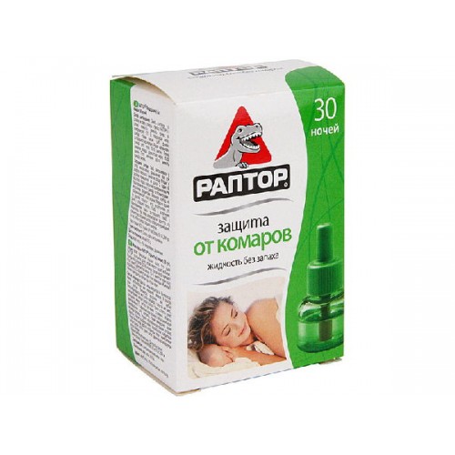 Раптор Жидкость от комаров "30 ночей" - отличное средство от комаров. Жидкость используют для защиты от летающих насекомых в доме, она обеспечит защиту в течении всей ночи. Один флакон рассчитан на 30 ночей. Средство безвредно для человека и домашних животных.